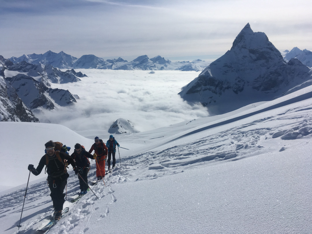 Perjantaina meillä on nousua vain n. 300 metriä, jonka jälkeen pääsemme rauhassa nauttimaan pitkästä laskusta Zermattiin ja ehdimme alas kylään (ja takaisin Verbieriin tai Chamonixiin) hyvissä ajoin.
